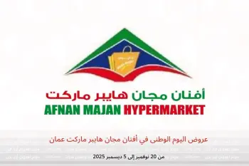 أفنان مجان هايبر ماركت عمان تعلن عن تخفيضات جديدة بعنوان « عروض اليوم الوطنى » المتوفرة حتي يوم 5 ديسمبر 2025, عروض جديدة وأسعار فقط في عمان.