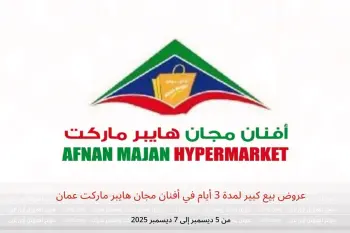 أفنان مجان هايبر ماركت عمان تعلن عن تخفيضات جديدة بعنوان « عروض بيع كبير لمدة 3 أيام » المتوفرة حتي يوم 7 ديسمبر 2025, عروض جديدة وأسعار فقط في عمان.