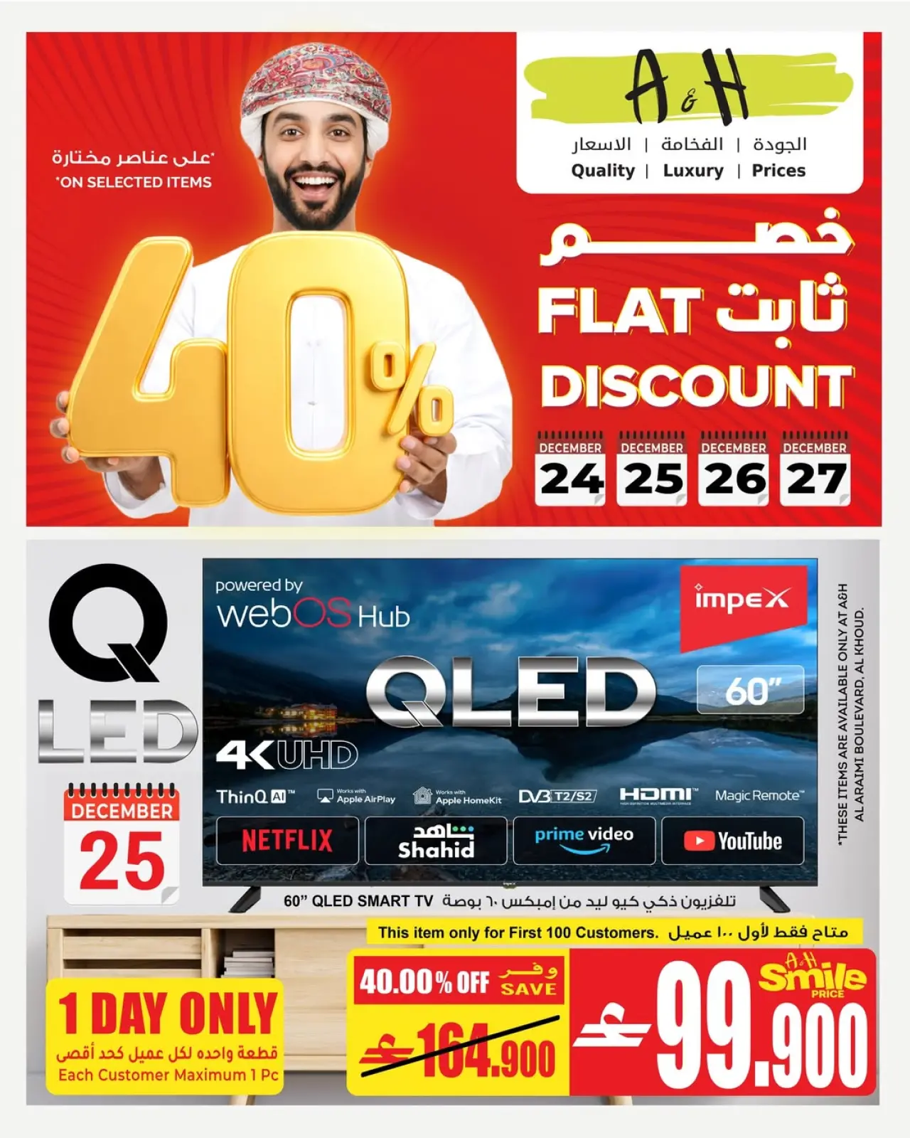 تنويه: صور وأسعار عروض الخصم الثابت في أيه أند أتش عمان المعروضة في هذا الكاتالوج لأغراض توضيحية فقط، وتخضع للتوفر في الفروع خلال فترة العرض.