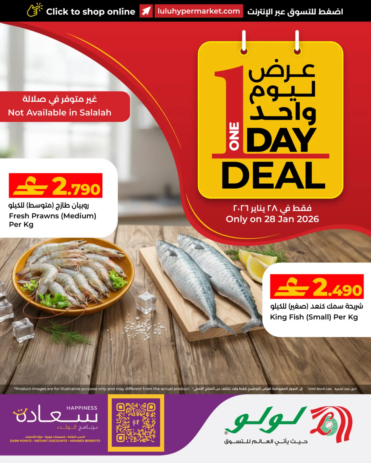 تنويه: صور وأسعار عروض المأكولات البحرية ليوم واحد في لولو عمان المعروضة في هذا الكاتالوج لأغراض توضيحية فقط، وتخضع للتوفر في الفروع خلال فترة العرض.