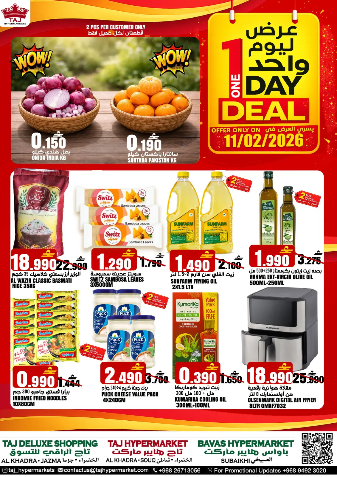 اكتشف أحدث عروض تاج هايبر ماركت في عمان اليوم وتصفح كاتالوج عرض يوم واحد واستفد من أفضل الأسعار حتى 11 فبراير 2026.
