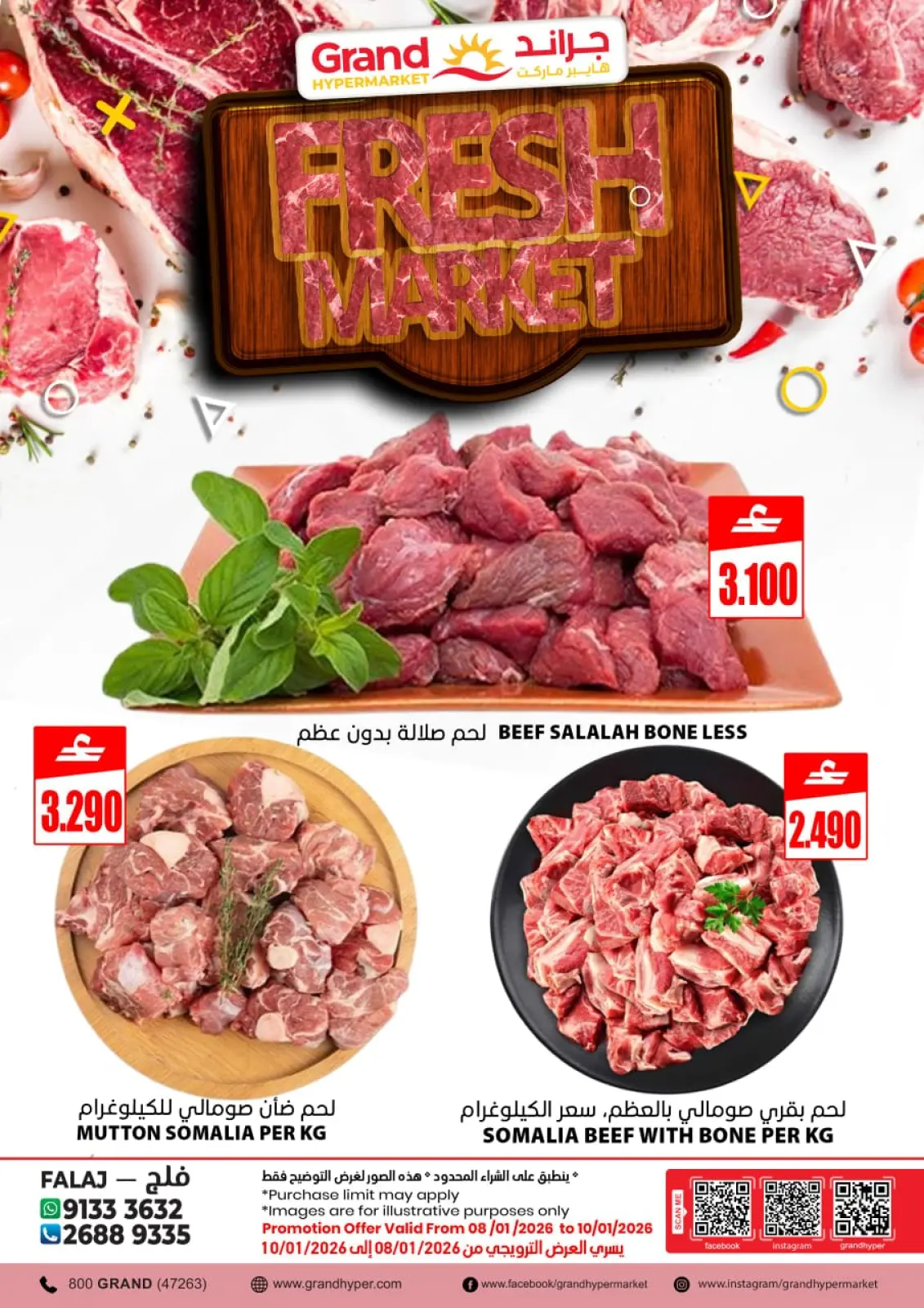 Discover the latest Grand Hypermarket offers in Oman today in Falaj Alqbail branches. Browse the Meat Deals catalog available until 10 January 2026.