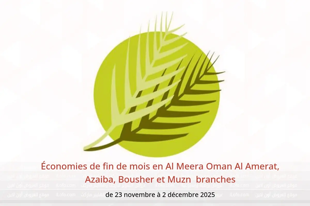 Al Meera Oman dans les branches Bousher, Al Amerat, Azaiba et Muzn annonce de nouvelles réductions intitulées « Économies de fin de mois » disponibles jusqu'au 2 décembre 2025, de nouvelles offres et prix uniquement en Oman.